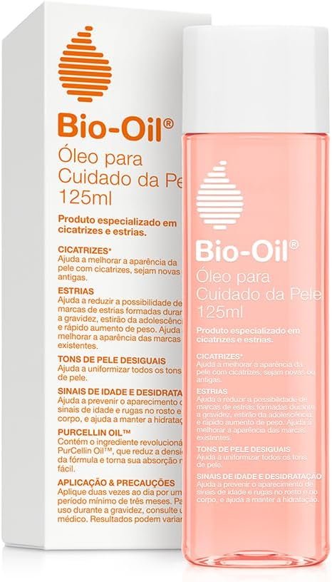 Bio-Oil Óleo para Cuidado da Pele O Bio-Oil é um óleo especial que ajuda a cuidar da pele e melhorar a aparência de estrias, cicatrizes, manchas e linhas do tempo. Ele hidrata profundamente sem deixar a pele grudenta, graças à sua textura leve e fácil de espalhar. Com uso diário, a pele fica mais macia, hidratada e com aparência mais uniforme. Pode ser usado em todo o corpo e é ideal para quem quer cuidar da pele de forma simples e eficaz.